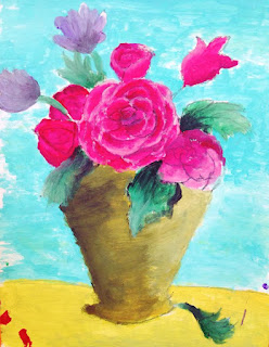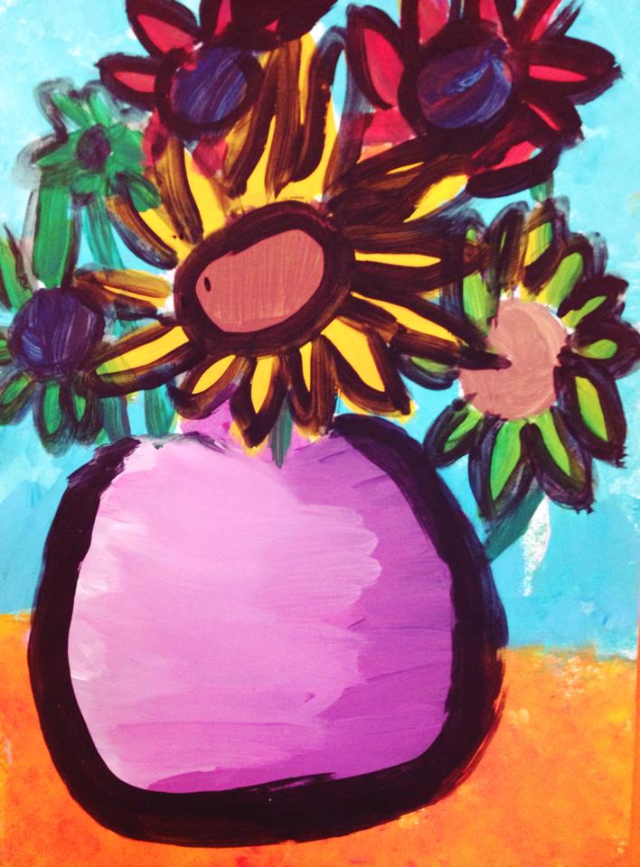 An important element of art, VALUE, was discussed in this artwork. Students were shown how to demonstrate value in their artwork by mixing paint colours to create light and shadow. You can see where light and shadow has been created and colours blended on the vase in these artworks. Bold outlines were also added in keeping with the Van Gogh style of painting. A brilliant effort by grade 3 and 4 students!